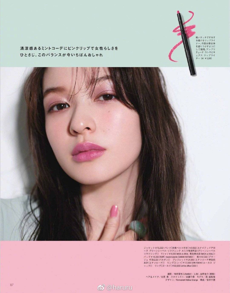 森绘梨佳拍摄日杂《Oggi》2019年4月号的写真,穿薄荷绿色休闲服饰搭配嫩粉色口红色号,可冷艳高贵可甜美可人。